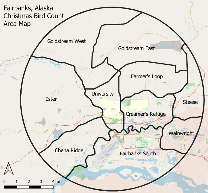 If you live inside the Fairbanks count circle, you can count birds coming into your feeder. But you don’t have to live inside the count circle to participate on a field team! It’s fun to join other birders to count our avian neighbors, and it contributes valuable scientific data.