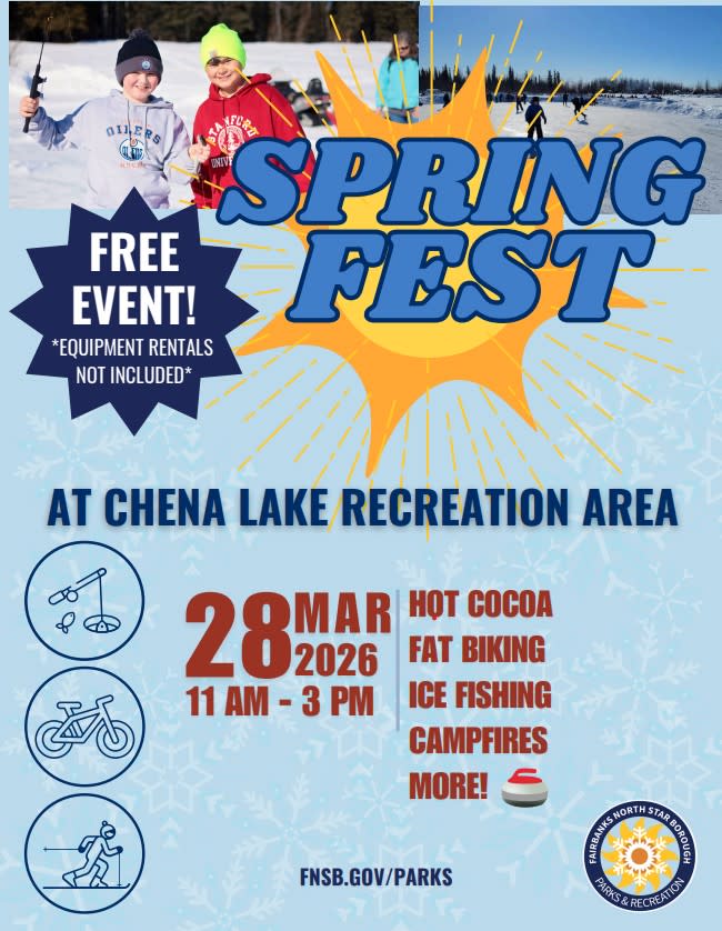 Join us at Chena Lake Recreation Area for a spring celebration. Fairbanks North Star Borough Parks and Recreation will host a day of ice fishing, hot cocoa, campfires and fun. Admission is free.