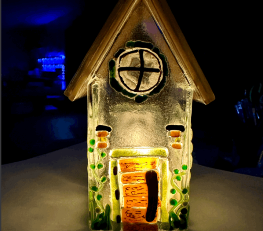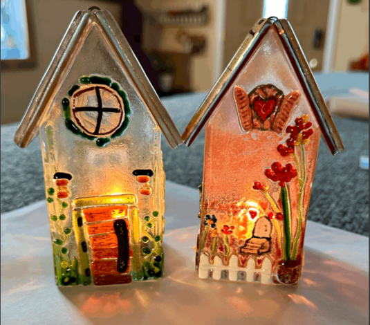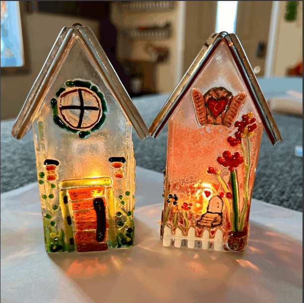 Come decorate a fun Glass House. I’ll have 4 sides and roof pieces cut and ready for you. Use custom mosaic glass, paints and other glass embellishments to design your house. Each roof will be fired with wire and bent to fit; it will be removable. I will silicone the sides together after firing and finish it off with an LED tea-light. Such a sweet little house, it’s sure to light up someone’s day!