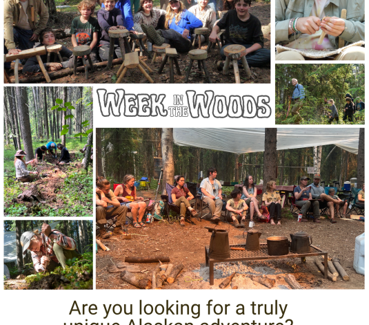 Week in the Woods is an intergenerational immersion in the boreal forest of Interior Alaska that nurtures a sense of belonging through explorations in natural history and craft, while living in the best of all classrooms – the woods.